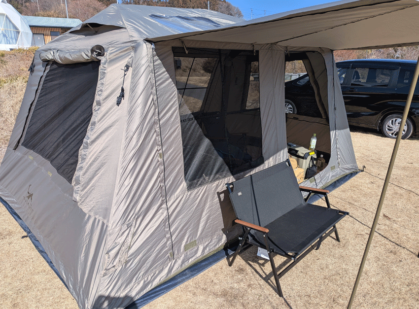 さっそく設営をサクサク済ませてひと休み。2月というのに動くと汗が噴き出るほど暑い。そして冷たいお茶が最高にうまい。