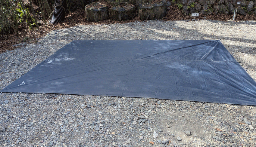 サイトは思ったより縦長で、車を横付けすると横幅がギリギリぽい。とりあえずグランドシートを敷いてサイズ感を確認。