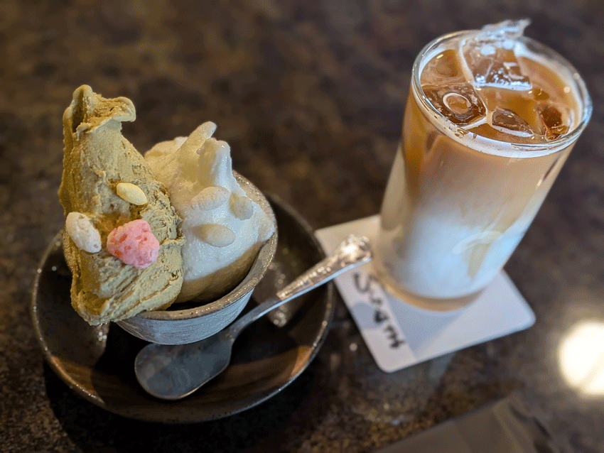 ジェラートがおすすめらしく、アイスカフェラテと一緒にジェラートを注文。ミルクとピスタチオのダブル。