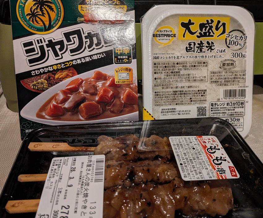 レトルトごはんとレトルトカレーと焼き鳥の豪華メニュー。