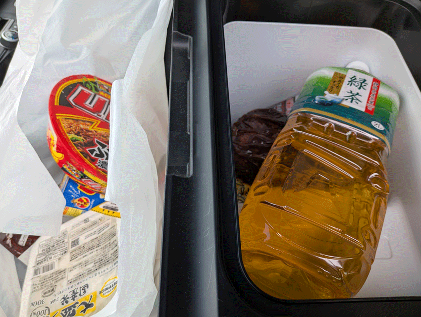 まずは、いつものご近所スーパーへ買い出しに。カップラーメンやらレトルト食品やら飲み物やらお菓子やら、色々と買い込み車へ。