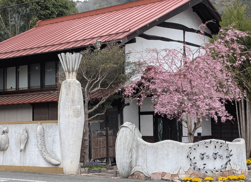てことで、11時ちょうどに「古民家レストランぽれぽれ」さんに到着。特徴的な白壁と野菜のモニュメントで、遠目からでもかなり目立ってます。入り口の桜?も美しい。