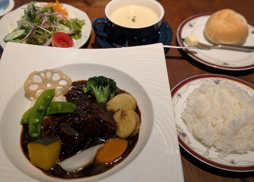 てことで、ランチメニューの中からビーフシチューをチョイス。セットのライスとパンのいずれかを選ぶのですが、どちらも美味そうで選べず、結局両方注文。さらに新玉ねぎのポタージュとデザート&コーヒーを付けて。