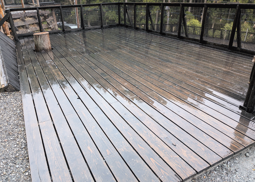 当然、地面は雨でずぶ濡れですが、ウッドデッキサイトなのでまだ全然マシ。今日は夜まで雨予報で、待っていても止む気配はゼロ。覚悟を決めて設営スタートです。