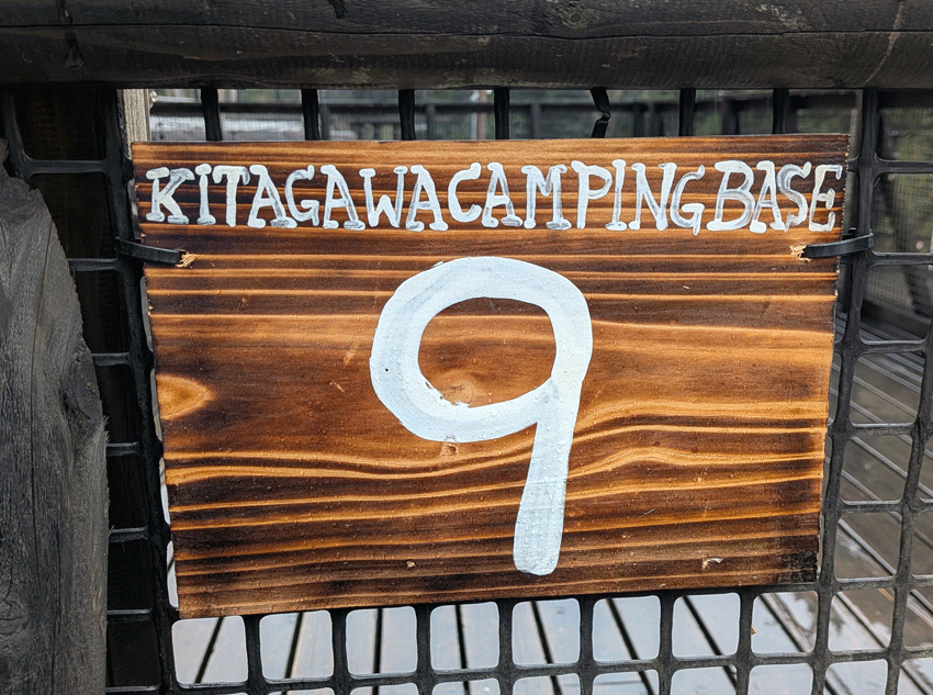 てことで、13時少し前に本日のぼっちステージ「喜多川キャンピングベース」さんに到着。受付でチェックインとステッカー購入を済ませ、案内されたのは上段にある9番サイト。