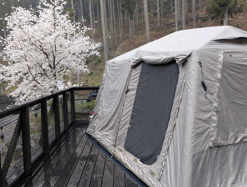 結果、シャワー浴びたのかってくらいにずぶ濡れになりながら、なんとか設営完了。見晴らしも良く、テントのすぐ横に満開の桜が咲いていて、雨さえ降っていなければ最高のサイトなのですが。