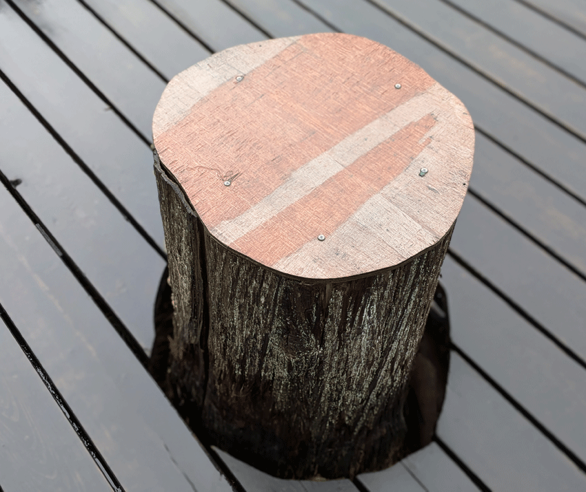 この切り株のせいで、思った配置で設営できず、雨の中で何度もセッティングし直すハメに。