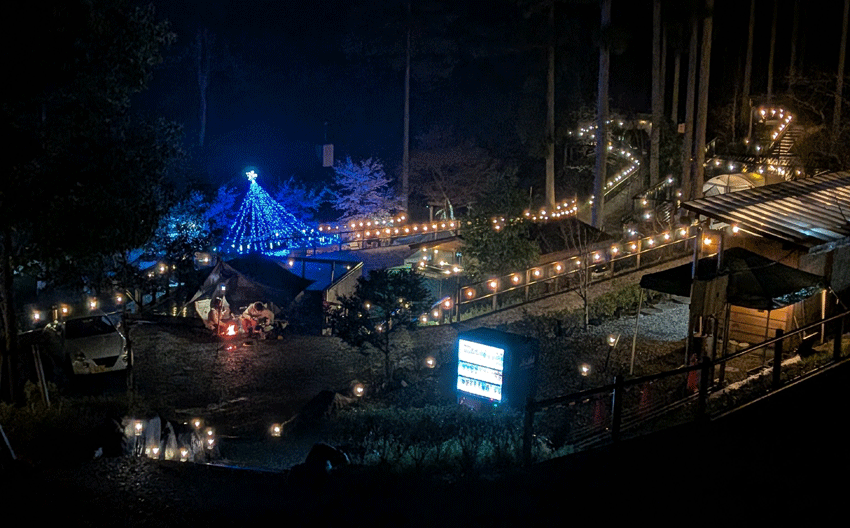 洗い物のために外に出ると、キャンプ場がライトアップされていました。雨で星空は見えないけど、これはこれでキレイです。
