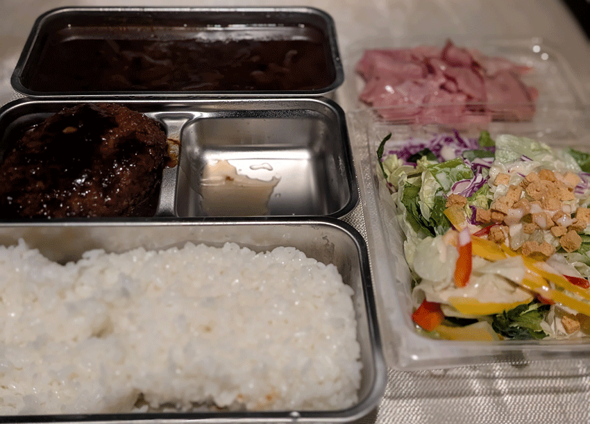 熱々のビーフシチューとハンバーグ、白米とサラダと牛タン。腹パンパンになりながら完食です。