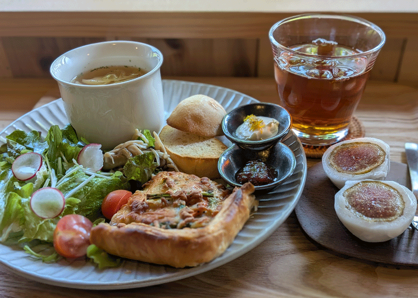 僕の入店と同時にちょうどカウンター席が空いたようで、ベストタイミングで1名様ご案内。ただ、ランチメニューは既にほとんど完売しており、唯一残っていたキッシュのセット(春野菜の彩りキッシュ農家風)を注文。ついでに名物とお薦めされたイチジク大福もデザートに追加して待機。