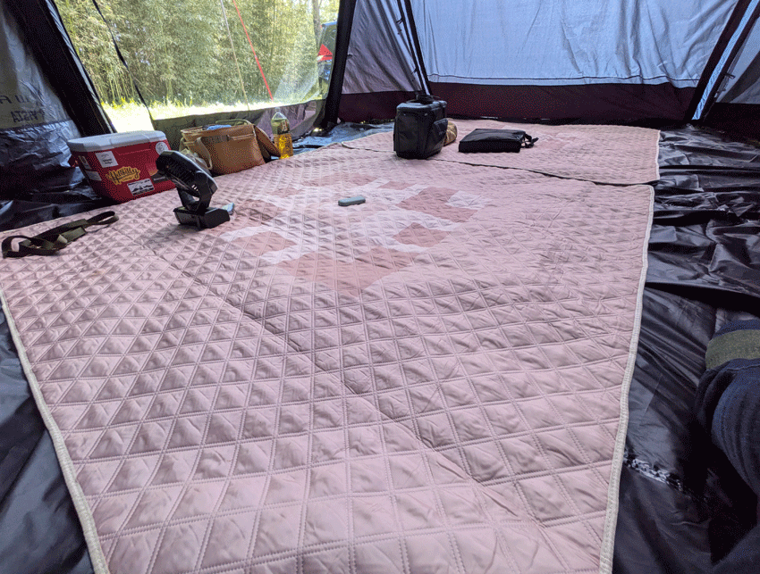 至極のランチタイムを終え、テントに戻り、グランドシートとマットをセット。