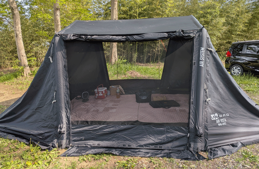 WACさん初めてのエアテント、その名も「Air Vista」。カラーはブラック。初めての黒いテントです。しかも、初回300個までセール価格で買えるとのこと。欲望のままに購入してしまいました。