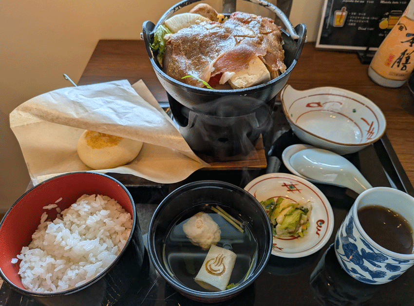 温泉もあるので、あとでこちらにまた戻ってくるのですが、まずは腹ごしらえってことで、4月末までの限定メニューのイノシシ鍋セットを注文。ついでに胡桃味噌のおやきも追加。