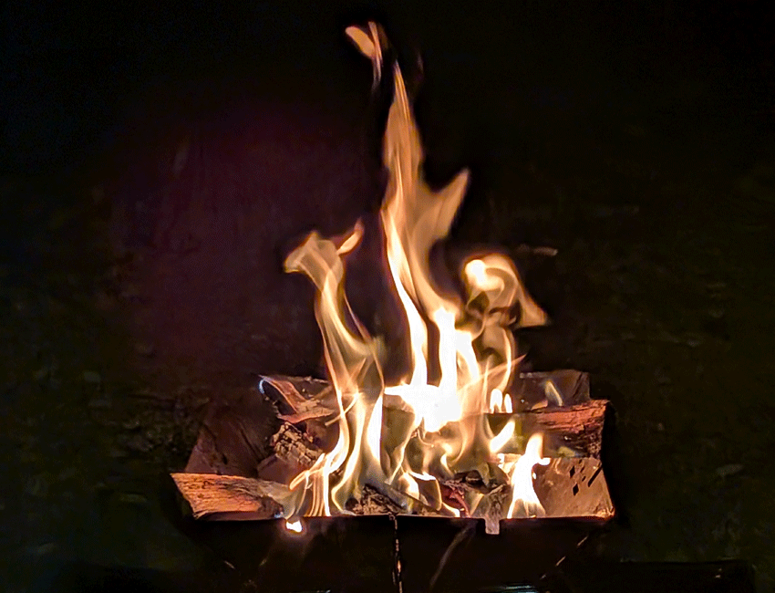 スマホゲームやったりLINEしたり、お茶飲んだり一服したり。ノンビリしてたら辺りもそれなりに暗くなってきたので、焚き火に着火。なかなか火がつかずに若干苦戦したものの、なんとか無事にファイヤー。