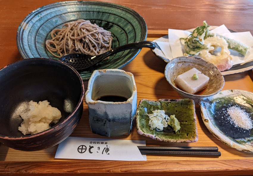 キャンプ場に行く前に、地元のグルメを堪能しようと、お昼前に全粒粉蕎麦とき庵さんに立ち寄り。どうやら地元では有名なお店のようです。
