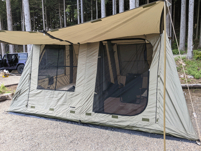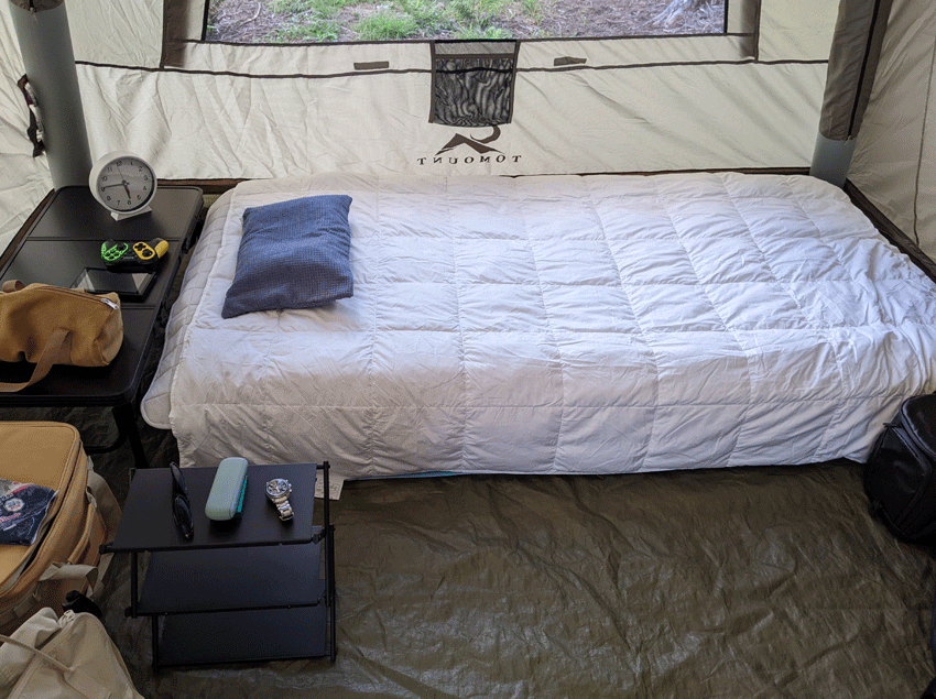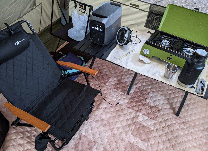 テントの中に荷物を運び入れて、ベッドやらテーブルやらをサクッと作り、中の設営も完了。今日はテントの中にカーペットも敷いて、こないだポチッたばかりのニューチェアもセット。うん。良い感じです(自画自賛)。