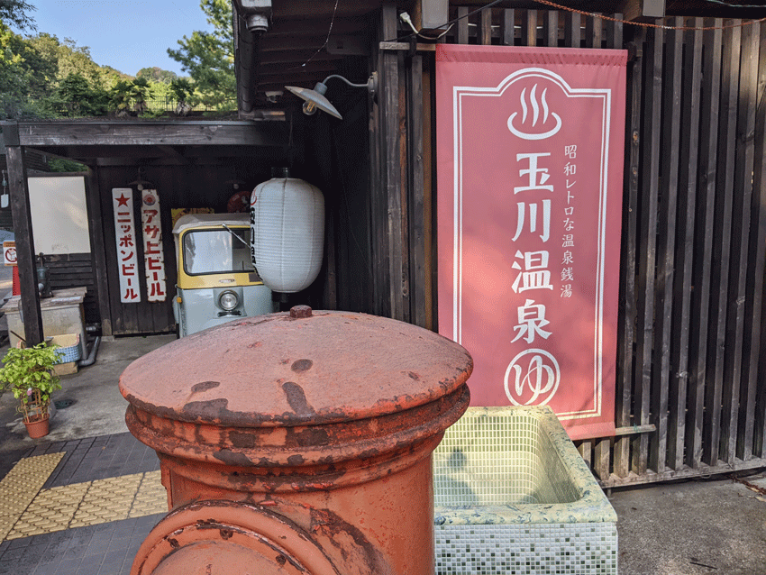 そんなこんなで、設営で汗だくになった体をすっきりさせるため、30分ほど山道を下り、ときがわ町の温泉に向かいます。今回は、昭和レトロが人気の玉川温泉へ。