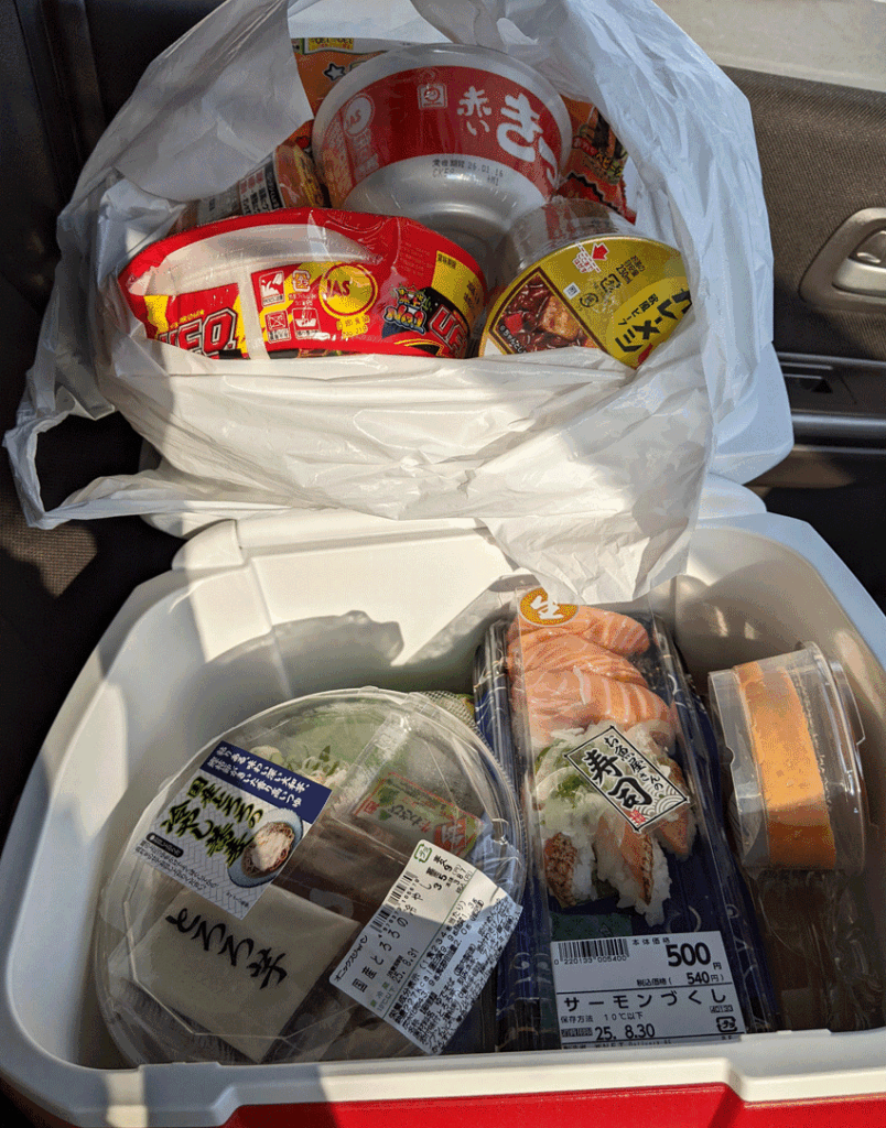 帰る途中でスーパーに立ち寄り、夜のキャンプ飯と明日の朝飯などを買って、クーラーボックスにぶち込み、またまた山道へ。