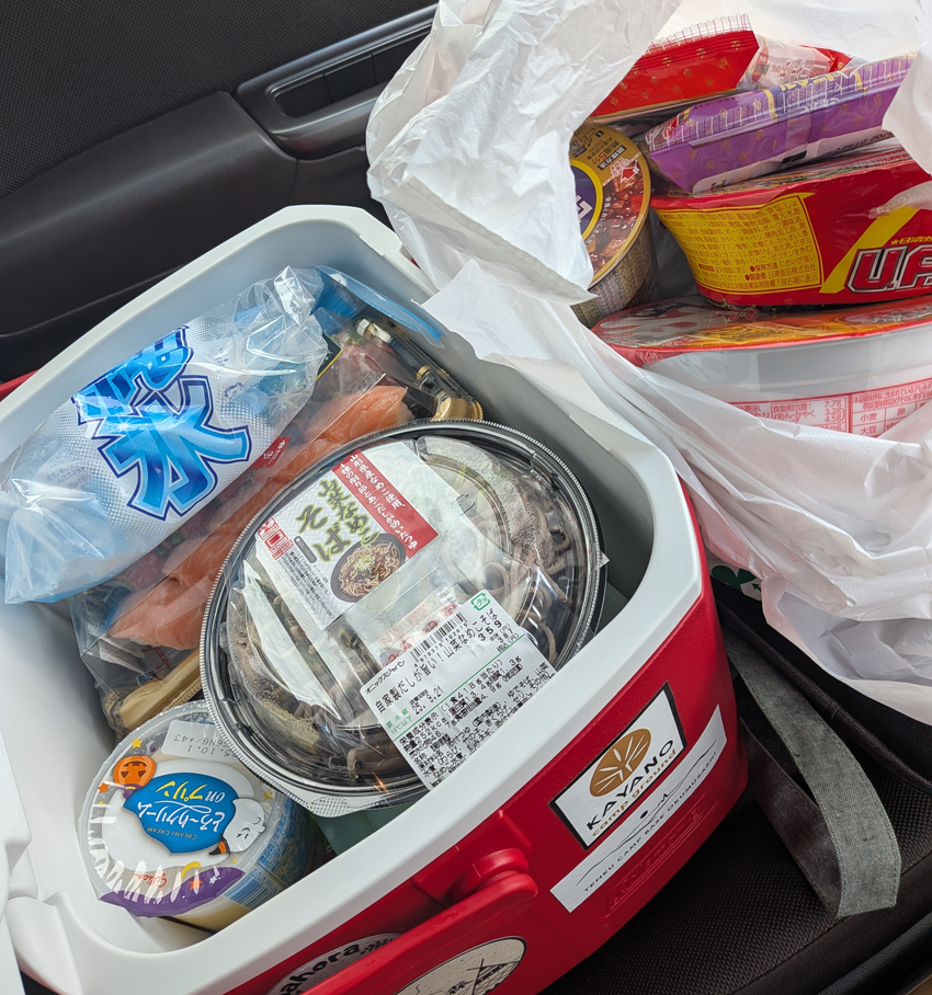 いつも通り、水やお茶、氷と夕食、朝飯などなどをまとめて買い込み、クーラーボックスへぶち込みます。100均のセレアが併設されていたので、ついでにガイロープを数本購入。本日の買い出し終了です。