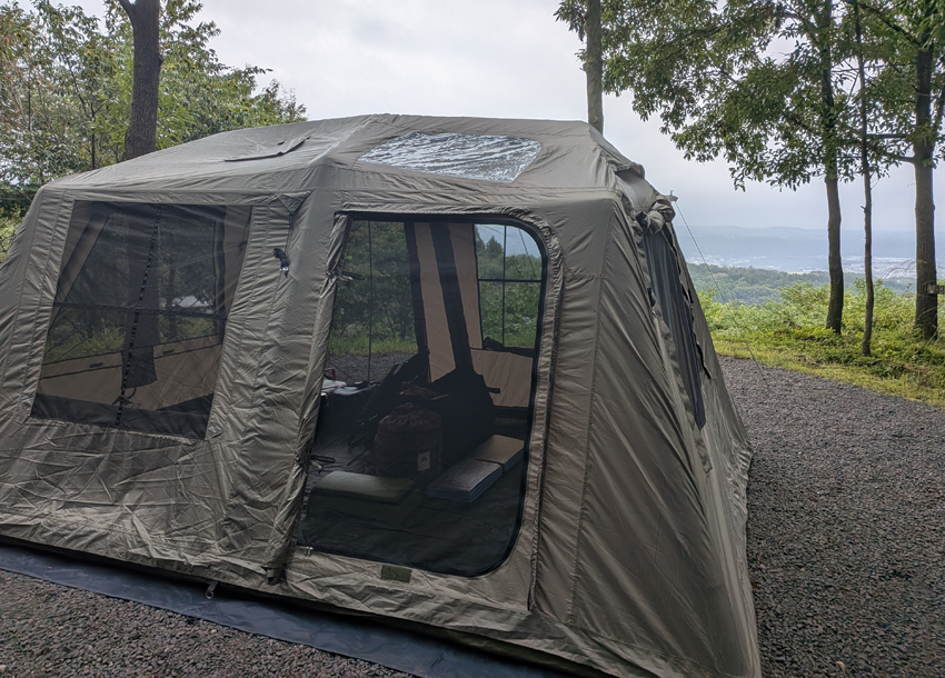 一応、夜になって奇跡的に晴れてくれることを祈りつつ、夜景が見える方向、角度でグランドシートを敷き、シュコシュコとテントにエアを注入。ものの10分ほどで完成です。