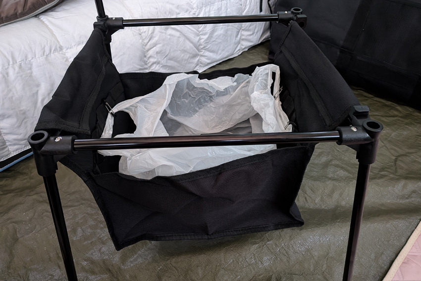 テントの中にすべての荷物を運び入れて、中もゴリゴリ整えていきます。ちなみに今回、新たに追加したキャンプアイテムがひとつ。こちらのダストボックス、そう、ゴミ箱です。