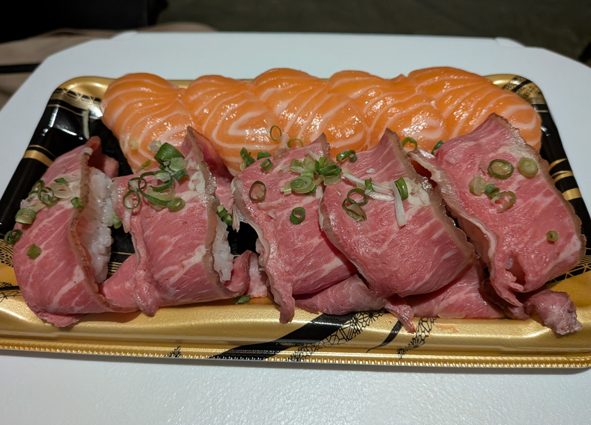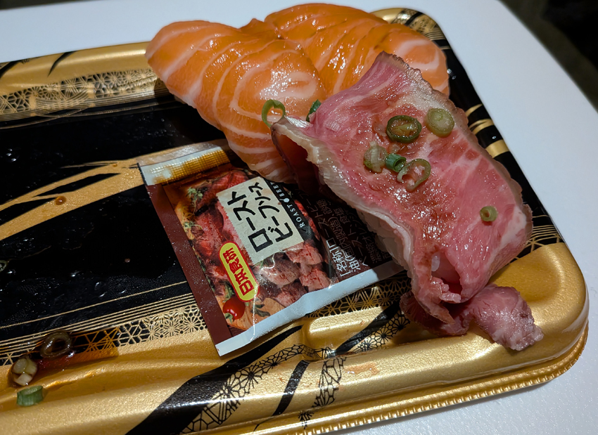 スーパーで買ってきたサーモン寿司とローストビーフ寿司。なんて美味しそう。パックに入っていた醤油を垂らし、パクパクと食べ進めていったところ、最後の最後でまさかの出会いが。