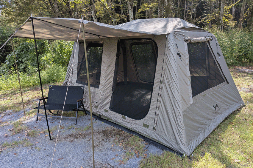 周りのお高いスノピテントなど気にもとめず、いつも通りのエアテントをシュコシュコ設営していきます。
