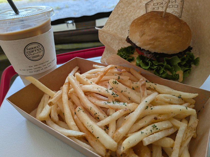 ちょうど風呂から出たところに、なんだかおしゃれなカフェがあり、コーヒーやらハンバーガーが売ってました。