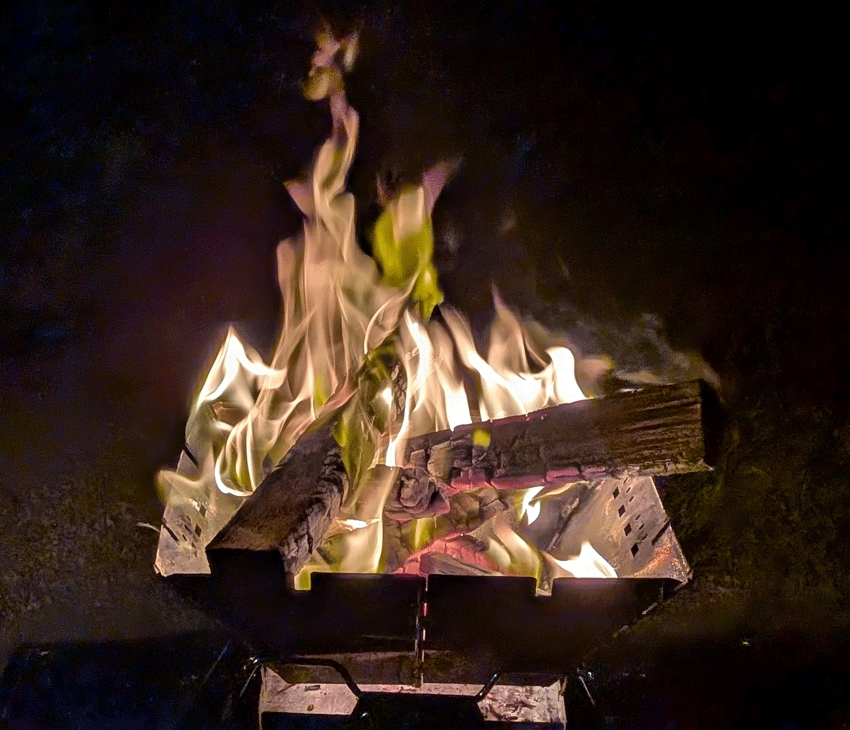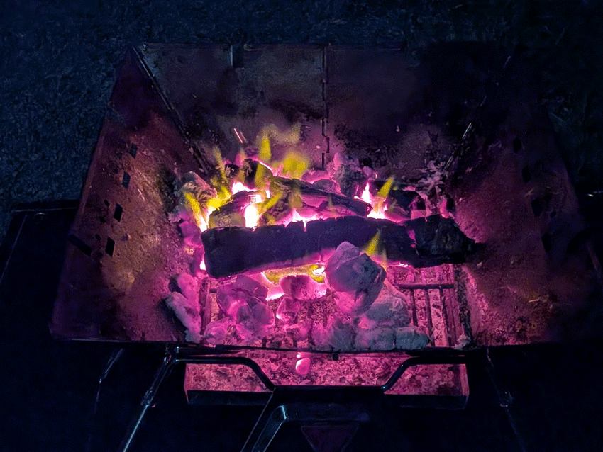 最初に入れた薪は1時間ほどでとろ火に。ちゃんと薪割りしたおかげか、燃え残りもなく綺麗に燃え尽きてくれました(写真のモードを間違えたのか色がピンクに)。空は厚めの雲で月も星も見えず。そうなると特に外にいる意味もないので、早々にテントの中へと戻ります。