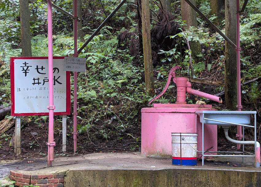 ピンクの井戸。その名も幸せの井戸水。サイトから井戸まで水を汲みにいって戻るのもそれなりに大変なので、お水の用意は忘れずに。