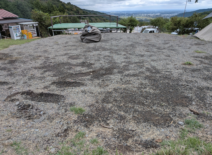 速攻で車を止めて、本日のぼっちステージを確保。管理棟のすぐそばでプライベート感こそないものの、目の前は開けていて景観は抜群。夜景や星空に期待です(曇天予報)