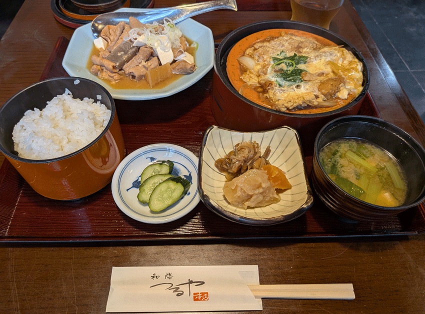 定食やラーメンなど色々なメニューのある老舗「つるや本店」さん。お店に入ると、僕の前にはお客さんが一組だけ。案内された席に座り、カツ煮定食とモツ煮込みを単品で注文。