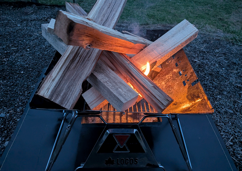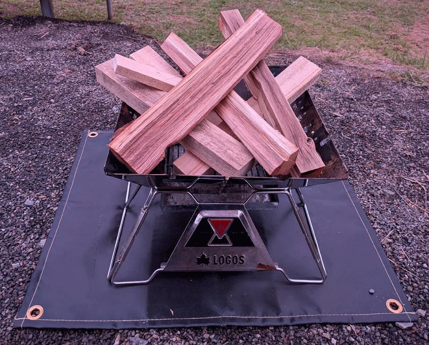 そんなこんなで17時くらいにはだいぶ暗くなってきたので、外に出て焚き火の準備を。こないだ割った薪がまだだいぶ残っていたので、それを焚き火台に置いて準備完了。暗くなるのを待ちます。