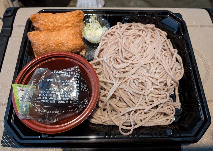 早寝のおかげで、朝5時に起床。この日の日の出は5時半過ぎなので、トイレを済ませつつ、日の出を待ちます。待っている間に朝飯を済ませようと、冷蔵庫から蕎麦(いなりセット)を取り出し、いなり寿司からパクリと一口。