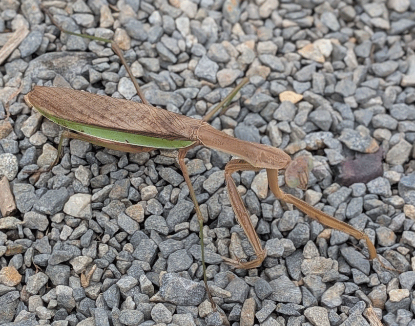 カマキリさん。大きくてカッコ良いです。残念ながら撤収の邪魔なので飛んでいってもらいました。