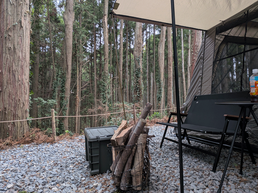 1番端っこでプライベート感は抜群。周りは森林で、夜景を楽しむタイプのキャンプ場ではありませんが、これはこれでGOOD。ただ、結構斜めになっているので、テントの張り方は工夫が必要です。