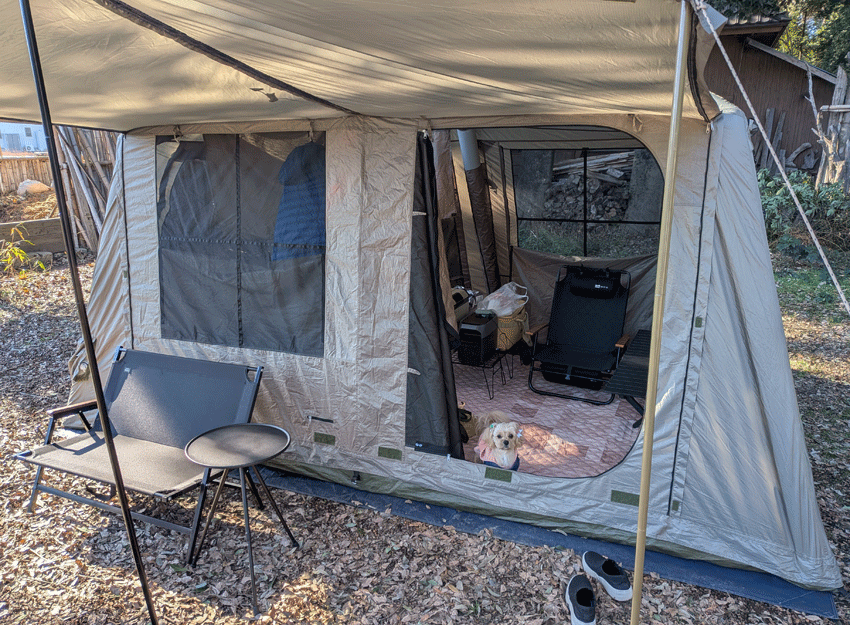 なにはともあれ、テントを立てないと何も始まらないってことで、エアテントと電動ポンプで爆速設営。イスやらテーブルやらをテントに突っ込み、愛犬用のトイレや寝床をセットして完了です。