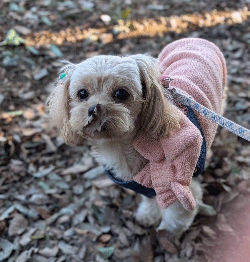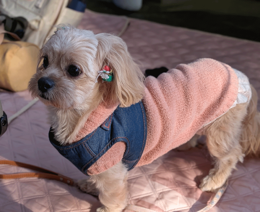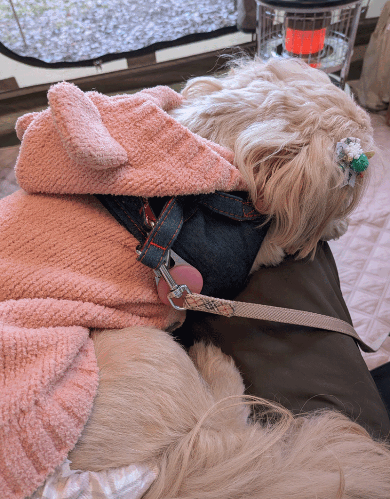 いつもと違う環境に疲れたのか、膝の上でスヤスヤと寝始めるワンコ。ストーブファンの暖かい風がよほど心地よいのか、ずっと膝から降りようとせず、こちらも一歩も動けず。