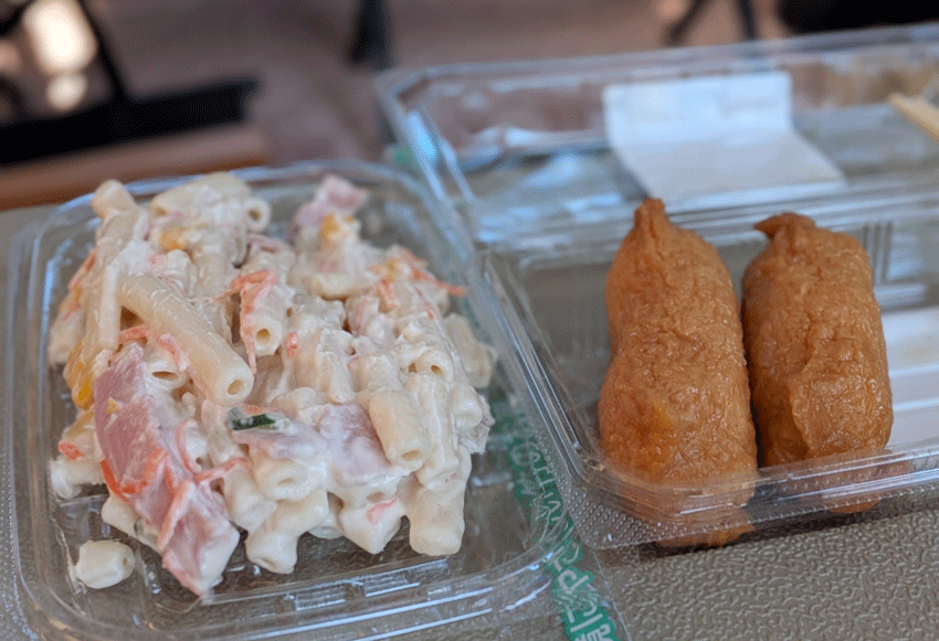 焚き火の火が消えたのを確認してから、少し遅めのランチタイムに。ワンコにはおやつのビスケットをあげながら、こちらはスーパーで買ってきた、いなり寿司とマカロニサラダをパクパク。